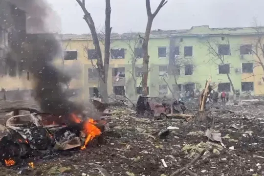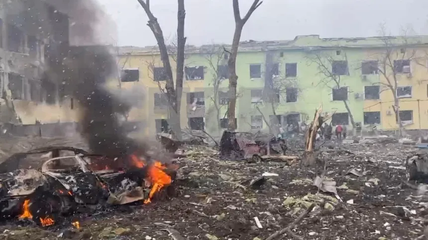 MARIUPOL: Samochody i szpital zniszczone podczas nalotu w Mariupolu w Ukrainie. Zdjęcie: Służba prasowa ukraińskiej policji państwowej / REUTERS