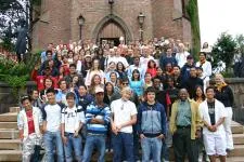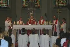 | Biskop Gerhard Schwenzer feirer utsendelsesmesse, flankert av fra venstre p. Elias Carr, p. Pablo Dagangon, p. Frode Eikenes, p. Paul Y, p. Grzegorz Gryz og p. Dominikus Thanh |