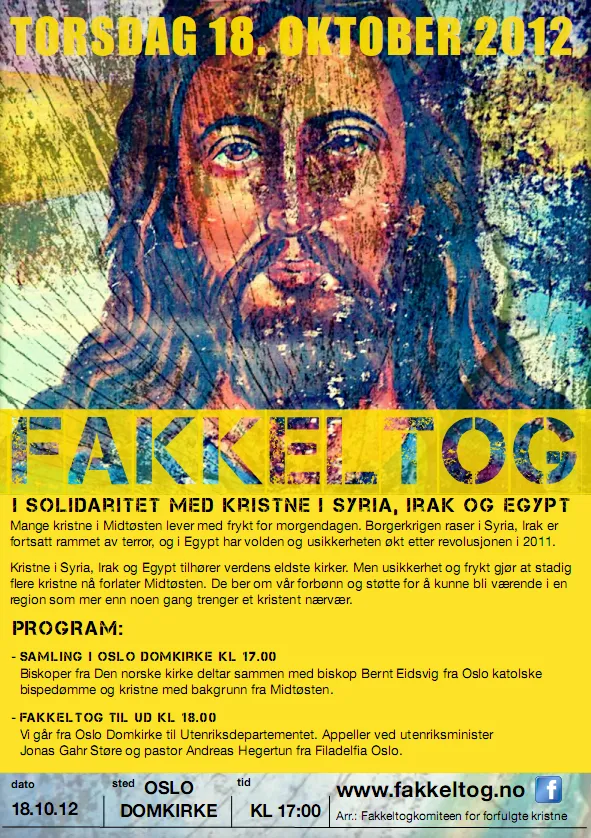 Klokken 17.00: Samling i Oslo Domkirke. Biskop Bernt Eidsvig fra Oslo katolske bispedømme deltar sammen med biskoper fra Den norske kirke, samt kristne med bakgrunn fra Midtøsten. Deretter blir det fakkeltog til Utenriksdepartementet kl. 18, og appeller ved utenriksminister Espen Barth Eide og pastor Andreas Hegertun fra Filadelfia Oslo.