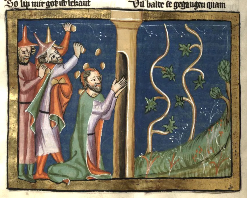 Bilde: Nabot blir stenet, illustrasjon i Weltchronik av Rudolf von Ems (XIV sec.), fra Wikimedia Commons (public domain)
