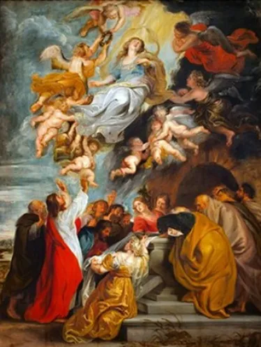 At Maria ble tatt opp til himmelen, betyr ikke at hun er reist bort til et fjernt land. Vi forestiller oss himmelen «der oppe». «Ære være Gud i det høyeste», synger vi. Det er ikke galt å ha slike forestillinger, bare vi er klar over at de ikke helt dekker virkeligheten. Himmelen er ikke et sted som ligger bortenfor universets grenser, men en dimensjon som vi ikke kan fornemme med våre jordiske sanser. Maria har altså ikke forlatt oss, selv om hun er tatt opp i himmelen. Tvert imot, nettopp slik har hun trengt dypere inn i verden.