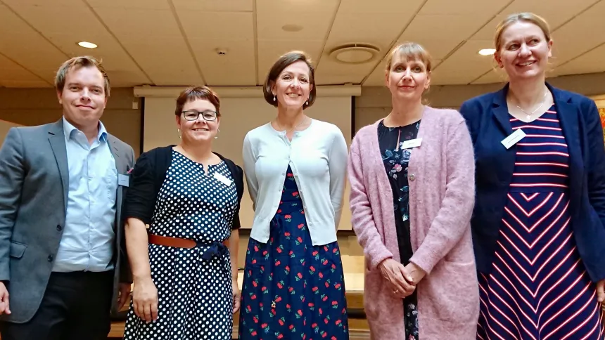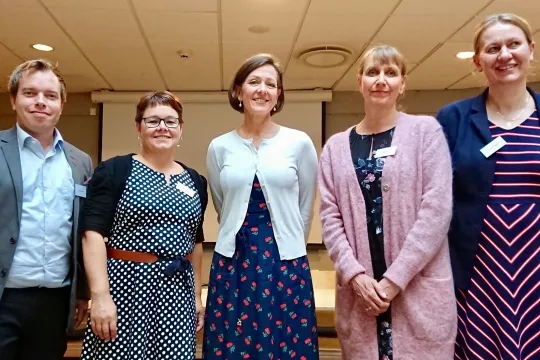 FEM AV SEKS: Generalsekretær Morten Dahle Stærk (f.v.), trisomibarn-mødrene Åsta Årøen, Siri Fuglem Berg, Anna Solberg samt samvittighetsfrihetsforkjemper og lege Katarzyna Jachimowicz var fem av seks foredragsholdere under årets Livsvernseminar. p. Hallvard Hole mangler på bildet.