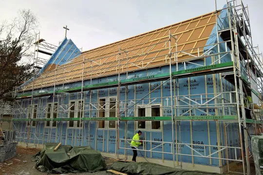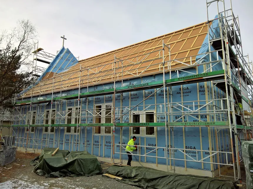 Limtredragere bærer taket, og veggene ble festet på disse. Et riktig vakkert tømmermannsarbeid som passer perfekt til kirkens vernehelgen, den hellig Josef, Marias ekteviede og Jesu adoptivfar. Isolasjonen er laget av trefiber. I gulvet ligger rør som henter varmen fra grunnboring.