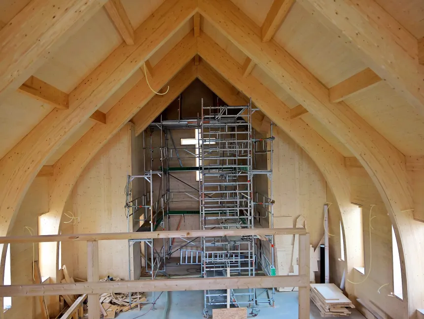 Syv håndverkere fra Erich Bundschuh Zimmerei fra Sør-Tyskland - med ham selv i spissen - fikk hjelp av syv frivillige under ledelse av tømmermann Bernhard Thoma fra organisasjonen «Kirchen für den Osten» - en tysk organisasjon som har bygget kirker i Øst-Europa. De jobbet alle gratis og brukte av egen ferie for å bistå i den hektiske fasen med å reise vegger, tak og tårn. Konstruksjonen består bare av tre.