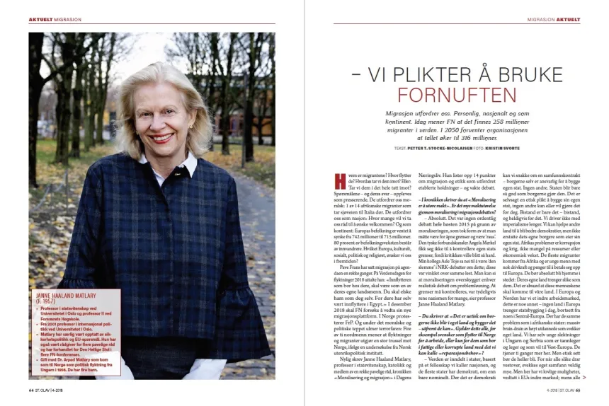 NORSK NAIVISME: «Vi nordmenn blir forskrekket over at vi ikke kan redde hele verden, og det er så naivt – skulle 5 millioner gjøre en forskjell for mange milliarder? Jeg påpeker at vår etiske plikt først gjelder familien vår, dernest våre landsmenn, så resten,» sa blant annet professor Janne Haaland Matlary til St. Olav kirkeblad 4-2018. Les intervjuet her. I kommentaren under svarer Ewa og Roger Bivand på Matlarys uttalelser. Faksimile: St. Olav kirkeblad 4-2018