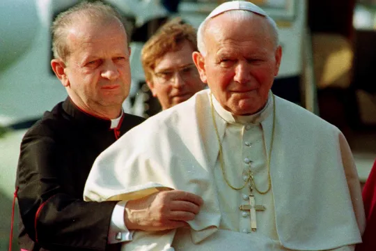 40 ÅRS SAMVIRKE: Kardinal og erkebiskop emeritus av Kraków Stanisław Dziwisz var i nesten 40 år den hellige pave Johannes Paul IIs privatsekretær. Her er de to sammen på reise i Como, Nord-Italia, 4. mai 1996. Foto: REUTERS/Files