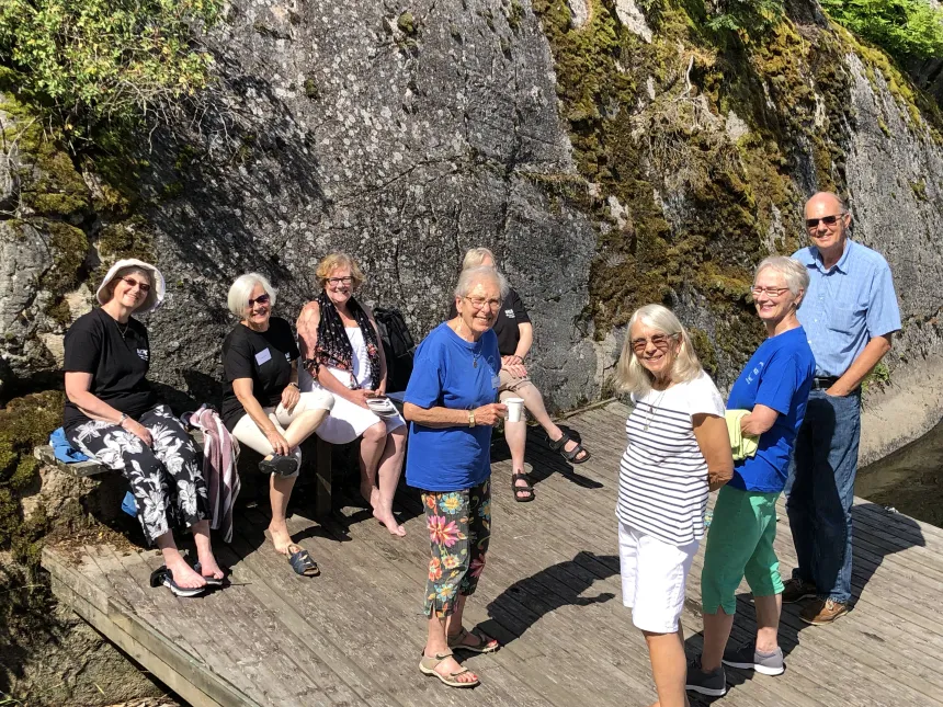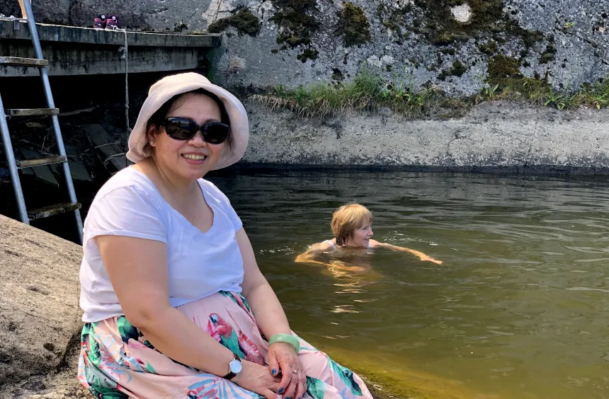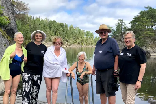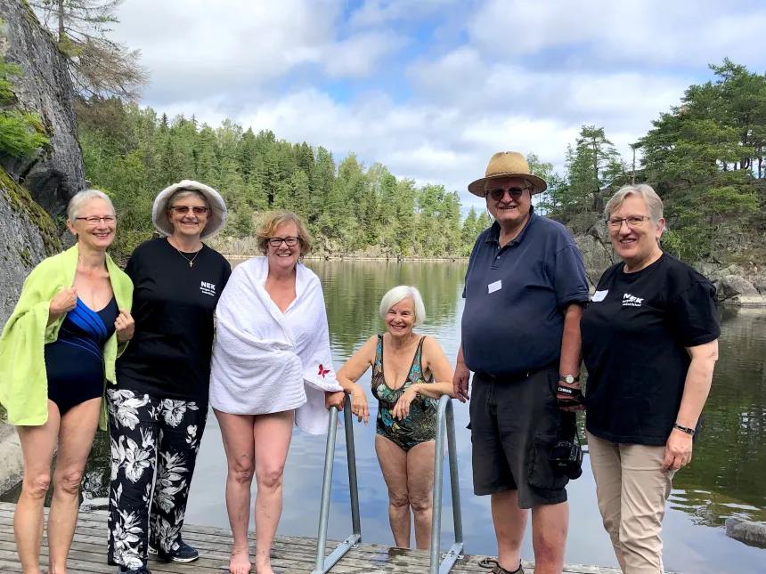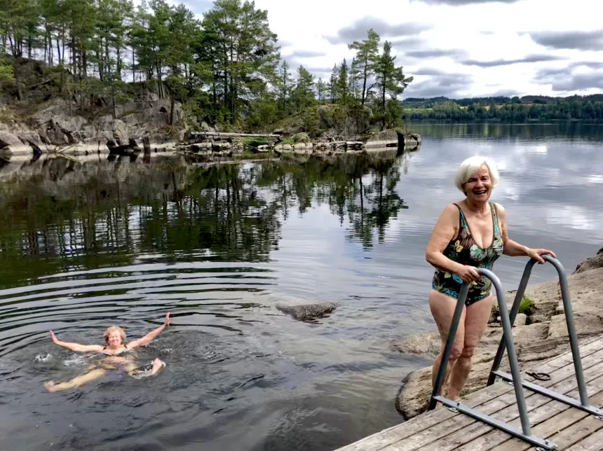 Jeg fortsetter nedover skråningen forbi kapellet og ned mot badebryggen. Der har noen ivrige damer allerede hoppet ut i vannet. – Det er nok atten grader i vannet, tjue når man treffer en strømning, sier Hege Mouland opp til oss på bryggen.
