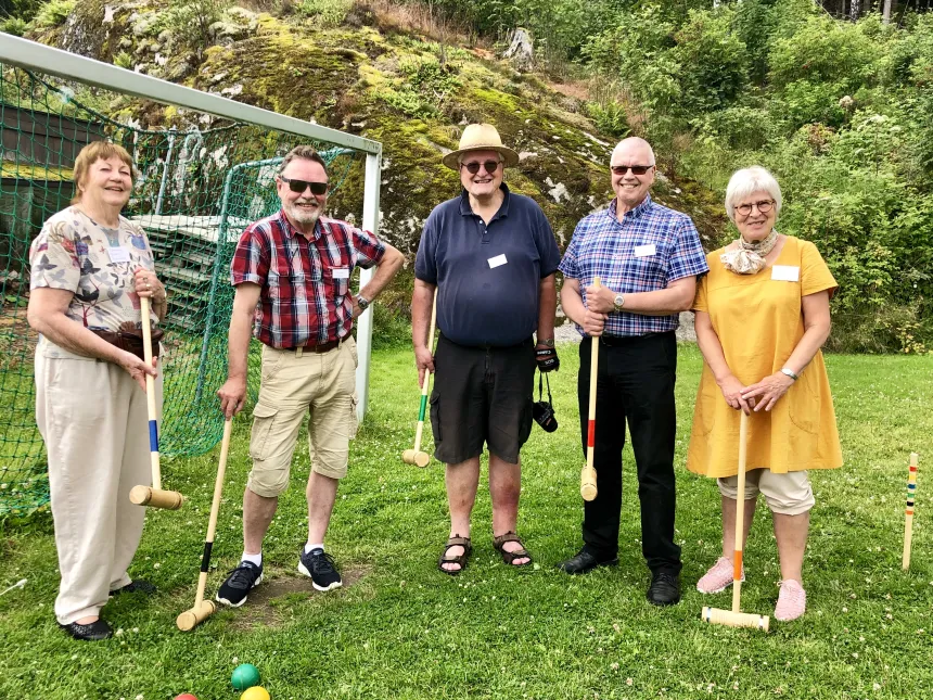 KROKKET: Fotballbanen fungerer også fint som krokketbane. F.H: Kjersti Hagenæs (65), Per Wullum (68), Gunnar Markussen (66), Henri Maatje (72) og Rønnaug Aaberg Andresen (81).