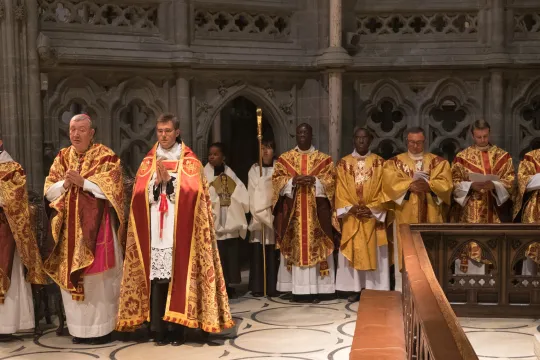 FORLATER OLAVS BY: P. Ole Martin Stamnestrø (t.h.) forlater Trondheim stift når han begynner sitt novisiat hos oratorianerne. Her fra Olavsmessen i Nidarosdomen i 2018 sammen med biskop Bernt I. Eidsvig og biskop-elekt Erik Varden. Foto: Jan Erik Kofoed