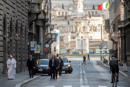 Pave Frans er på vei mot San Marcello-kirken for å be til jomfru Maria. Det er i denne kirken at det såkalte «mirakelkrusifikset» befinner seg. I 1522 ble det båret gjennom Romas gater og kvarterer, i håp om at en dermed kunne stoppe pesten som den gang herjet Roma.