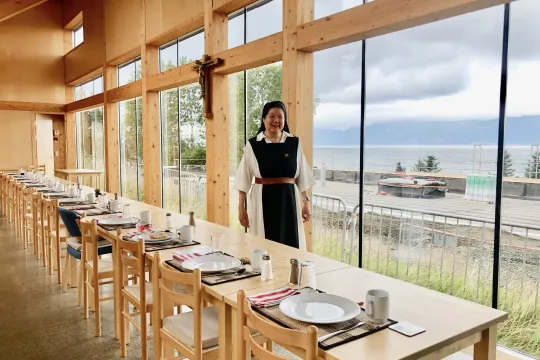 MOT FREMTIDEN: I refektoriet sitter søstrene på rekke og rad med ansiktet rettet mot fremtiden, dvs. nyfløyen som reiser seg mellom dem og Trondheimsfjorden. Sr. Sheryl (bildet), leder av Byggekomiteen, forteller at den forhåpentlig står ferdig tidlig på nyåret 2021.
