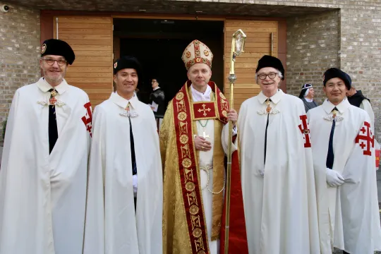 RIDDERE I NIDAROS: Flere av ordenens medlemmer var tilstede under den historiske bispevigselen i Nidarosdomen 3. oktober 2020. I midten nyvigslet biskop Erik Varden, fra venstre står ridderne Lars-Ole Svanenhielm Djupdal (seremonimester og skattmester), Hung Nguyen, deretter Knut Ødegård og Huan Nguyen. Foto: Mats Tande