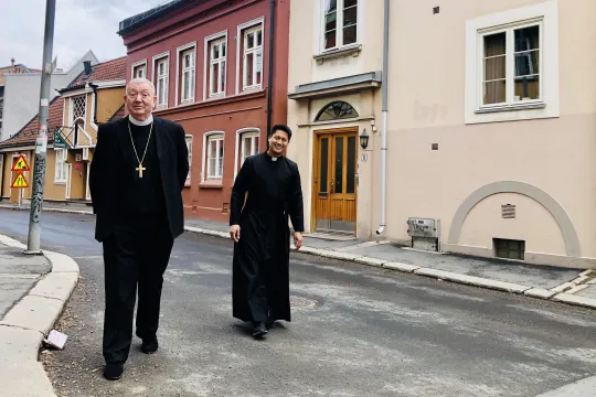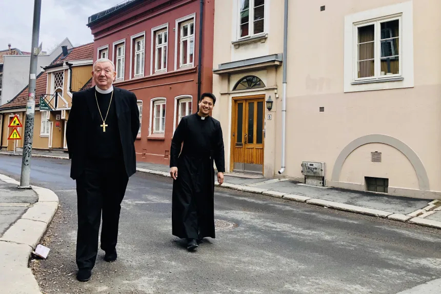 JUBILEUMSGLEDE: Biskop Bernt I. Eiidsvig og rektor p. Bjørn Tao Quoc Nguyen foran St. Eystein presteseminars lokaler i Akersveien, Oslo. – Seminaret er fremtidsrettet. Det kommer 2. og 3.-generasjonsinnvandrere som vil søke seg til et norsk presteseminar, fordi det norske er blitt deres identitet, sier rektor Nguyen. Foto: Petter T. Stocke-Nicolaisen