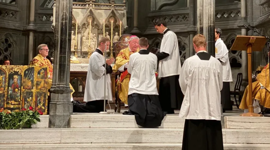 OLSOK 2020: Under Olsokmessen i Nidarosdomen ble seminaristene Trym Hellevigg Joachim Teigen innsatt som akolytter av biskop Bernt I. Eidsvig. Foto: St. Eystein presteseminar