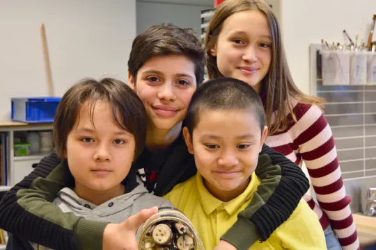 2019S GRØNNESTE HOTELLBYGGERE:Cecilia Sontum (øverst t.h.), Felipe Saldivar (øverst t.v.), Stephan Nguyen (nede t.h.) og Theo Pham Strømmen (nede t.v.) bygget insektshotell på St. Sunniva skoles Laudato si’-dag i 2019. Foto: Marija Ilic