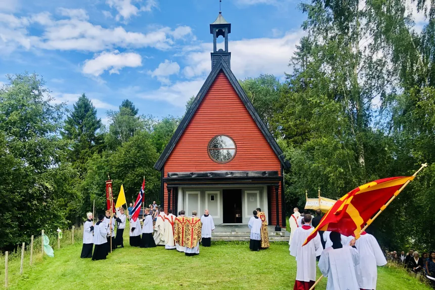 ST: OLAV KAPELL: Det katolske kapell ved slagstedet på Stiklestad er åsted for årlig olsokprosesjon og relikvievelsignelse. I år feires også messen her. – Bare noen timer før Slaget på Stiklestad – i drømmen om himmelstigen – hadde Olav kun ett ønske: Å være hos Kristus, sier biskop Erik Varden.