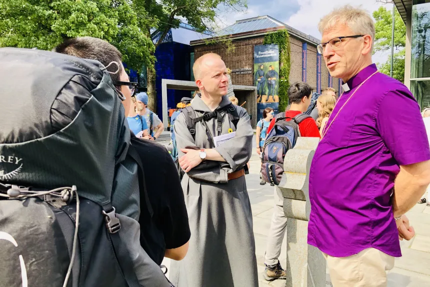 ØKUMENIKK I PRAKSIS: Da NUK-pilegrimene ankom Vestfrontplassen tirsdag 27. juli kl. 14.00, ble de ønsket velkommen av preses biskop Olav Fykse Tveit i Den norske kirke. Biskop Varden hadde gått den siste etappen sammen med de unge pilegrimene, deriblant flere av våre seminarister.