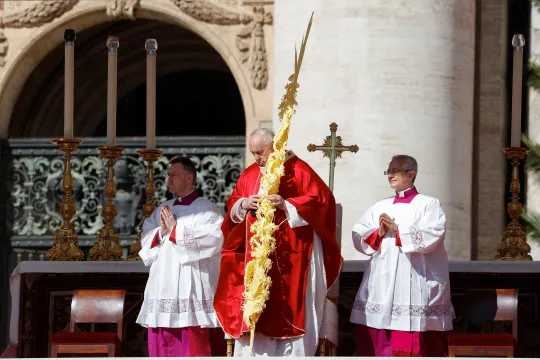 PALMESØNDAGSMESSE:– Brødre, søstre, slik gjør Gud også med oss: Når våre handlinger forårsaker ham smerte, lider han og har bare ett ønske: å kunne tilgi oss., sa paven i sin palmesøndagsmesse 10. april 2022. Samme dag uttalte paven seg om krigen i Ukraina og krevde våpenhvile i påsken. Foto: Remo Casilli, Reuters / NTB