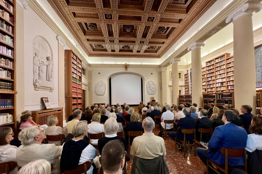 TROFAST OG FAST I TROEN: Årets Olavsseminar i Roma ble arrangert i Santa Maria dell’Anima, rett ved Piazza Navona. Temaet «Ordets makt» fylte salen med interesserte tilhørere og foredragsholdere i toppklassen. Her foredrar biskop Erik Varden under parolen «Kan litteratur redde liv? Om ordets makt». Foto: Peter T. Stocke-Nicolaisen