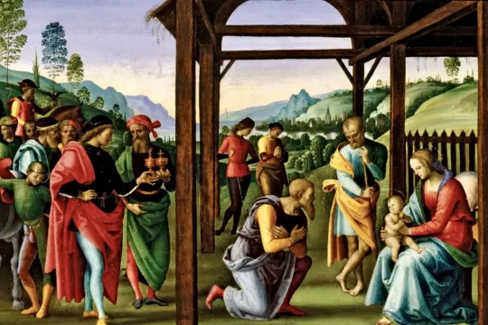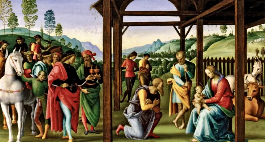 DE TRE HELLIGE KONGER:«Kongenes tilbedelse», olje på treplate av Perugino (1450 – 1523), malt 1496 – 98. Kan ses i Musée des Beaux-Arts, Rouen, Frankrike.