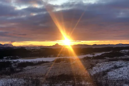 VERDENS LYS: «... det er i lys av dette barnet, det guddommelige lyset, at våre egne liv kan leves og forstås», skriver sr. Anne Bente Hadland i årets nyttårsbetraktning. Bildet viser Helgelandskysten mot Torghatten, som ses til venstre for solen. Begge foto: Petter T. Stocke-Nicolaisen