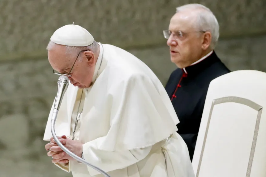 BØNN FOR OFRE: Pave Frans ber for jordskjelvofrene under onsdagsaudiensen 8. februar 2023 i Vatikanet. Foto: NTB / Reuters, Remo Casill