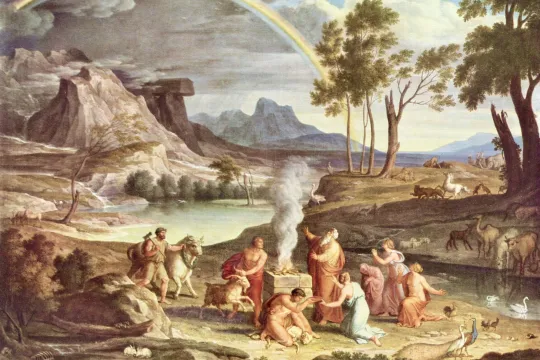 PAKTENS TEGN: «Noas takkoffer» (ca. 1803), maleri av Joseph Anton Koch, som er inspirert av Første Mosebok 8 – 9. «Paktstegnet, regnbuen, er i vår tid blitt merket for en kulturell og politisk bevegelse. Vi anerkjenner alt det som er edelt i bevegelsens målsetning. I den grad målsetningen taler om hvert menneskes verdighet, om lengselen etter å bli sett, deler vi den. Kirken fordømmer all urettferdig diskriminering, også på grunnlag av kjønn og legning», skriver de nordiske biskoper i sitt hyrdebrev.