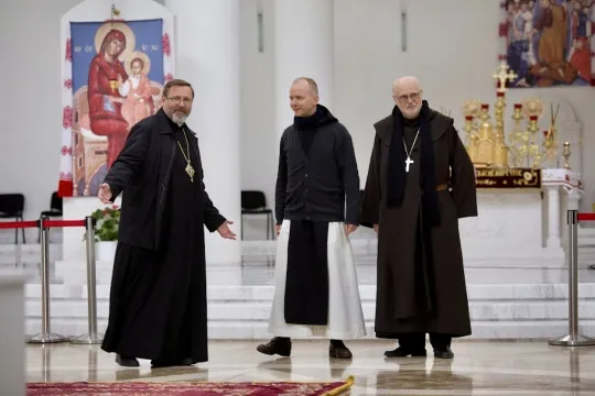 SOLIDARITETSBESØK: Kardinal Anders Arborelius (t.v.), biskop Erik Varden og storerkebiskop Svjatoslav Sjevtsjuk (t.h.) samtaler i Katedralen for den oppstandne Kristus i den ukrainske hovedstaden Kyiv. Foto: priv.