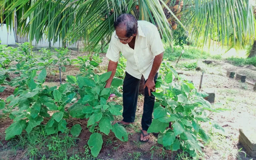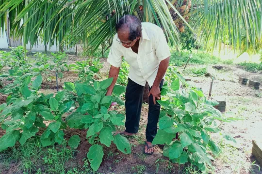 MAT PÅ SRI LANKA: Issatheen deltar i Caritas' matsikkerhetsprosjekt i Mannar. Her viser han frem kjøkkenhagen sin. Foto: Caritas Mannar