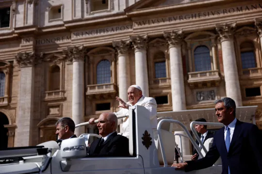 PÅ PLASS: Pave Frans hilser fra bilen sin på Petersplassen i Vatikanet, onsdag 13. mars. Foto: NTB / Reuters, Guglielmo Mangiapane