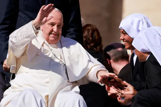 MØTT MED SMIL: Paven hilser på de troende som hadde møtt opp for å se og høre ham på Petersplassen i Vatikanet. Foto: NTB / Reuters, Yara Nardi