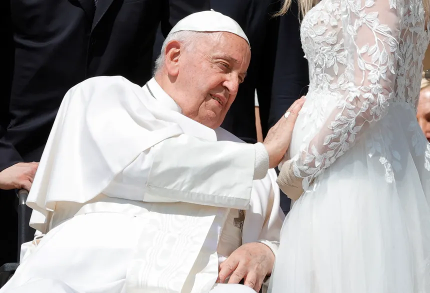 BLID HYRDE: Pave Frans holdt som vanlig audiens på Petersplassen i Vatikanet, onsdag 15. mai. Foto: NTB / Reuters, Ciro De Luca