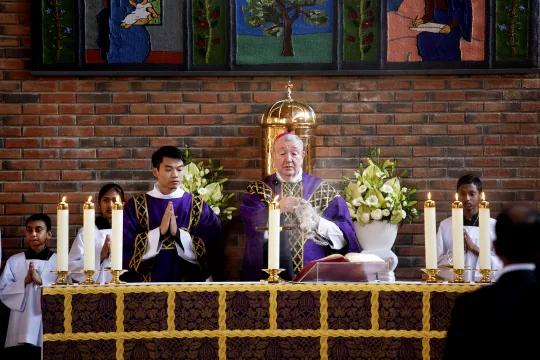 HISTORISK:For første gang kjøper Den katolske kirke en kirke av Den norske kirke – og for første gang selger Den norske kirke en av sine kirkebygg. – [Bredtvet kirke] var Hans Nielsen Hauges gård en gang i tiden – det var en medvirkende årsak til at vi kalte den St. Johannes (Hans er en kortform av Johannes), forteller biskop Bernt Eidsvig. Her ved kirkens alter under rekviemmessen for terrorofre på Sri Lanka i 2019. Foto: Kristin Svorte