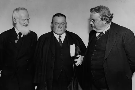 GOD STEMNING: G.K. Chesterton (t.h.) i selskap med to av sine venner, George Bernard Shaw (t.v.) og Hilaire Belloc. Han ble så nært forbundet med sistnevnte at Shaw fant på et fellesord for dem: «Chesterbelloc».