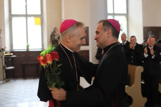 TIL LYKKE: Erkebiskop Georg Gänswein (t.v), apostolisk nuntius til Estland, gratulerer den nye biskopen av Tallinn, biskop Philippe. FOTO: Vatican News