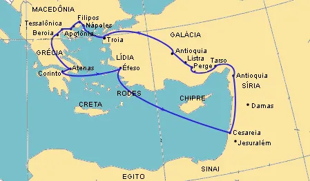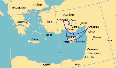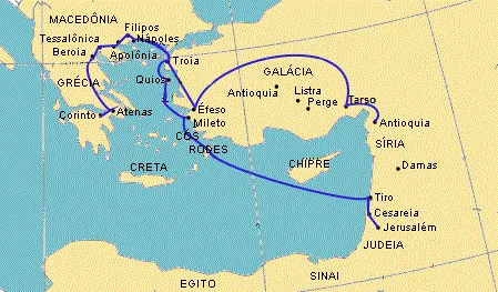 Pierwsza podróż misyjna w latach 45-48 i zawiodła Pawła m.in. do Antiochii, na Cypr, Pafos i Perge. Podczas drugiej podróży między rokiem 50 a 52 nauczał on m.in. w Derbe, Listrii, Frygii, Galacji, Myzji, Filippi, Tessalonikach, Atenach i w Koryncie.