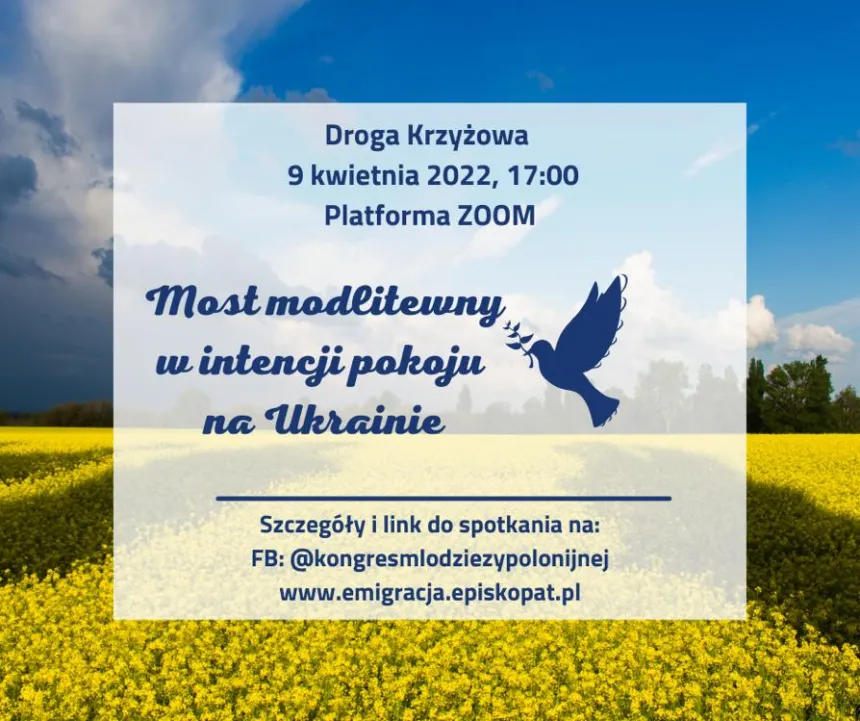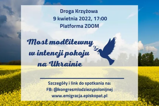 Podczas Kongresu będziemy się także modlić o pokój na Ukrainie. Drogę Krzyżową o godz. 17.00 poprowadzi młodzież z Ukrainy. Zapraszamy Was, a także Waszych przyjaciół i znajomych, stwórzmy most modlitewny w intencji pokoju na Ukrainie. Jeśli nie możesz uczestniczyć w całym spotkaniu Kongresu Młodzieży Polonijnej - Bądź z nami na modlitwie!